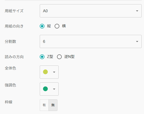 新規ファイル作成画面では、はじめにファイル名と備考を入力し、用紙のサイズや向き、配色などを指定します。