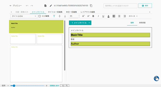 - 演題番号領域、メインタイトル、サブタイトル、著者、所属機関、ロゴ等を入力可能です。