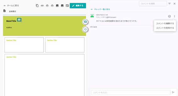 - レイアウトの調整が終われば、共同研究者等にプレビュー画面を共有し、コメントをもらいましょう。