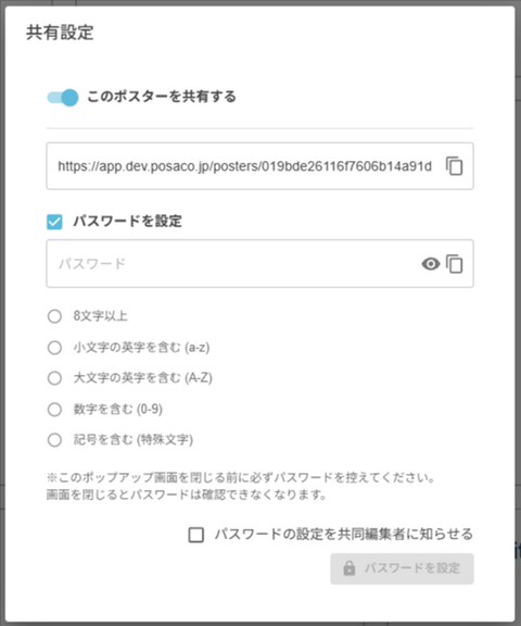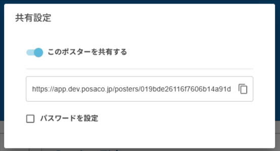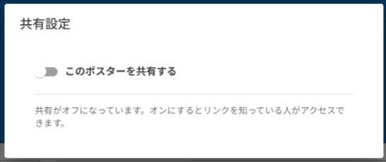 - 「このポスターを共有する」をONにすると、共有用リンクが表示されます。この時、このリンクを知っている人はプレビューを確認することができます(非会員もプレビューの閲覧が可能です)。